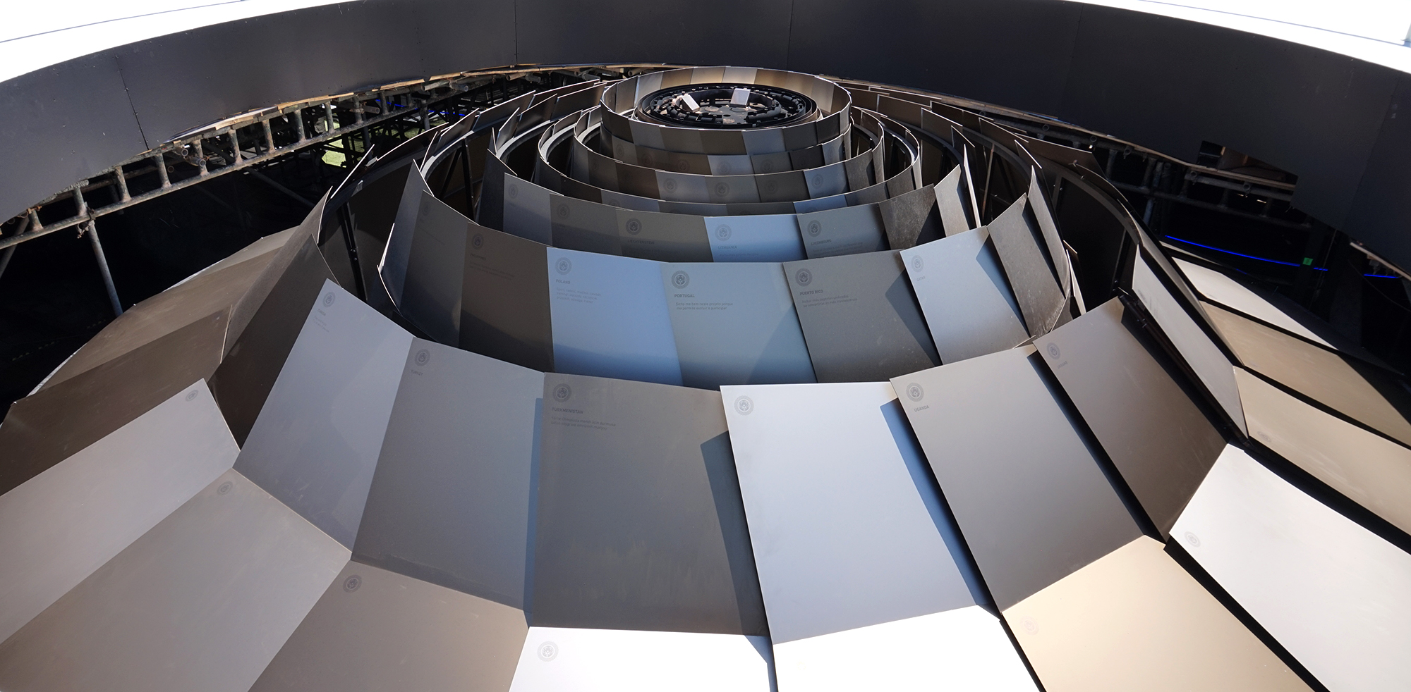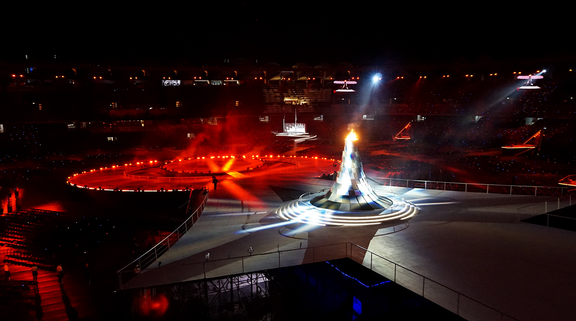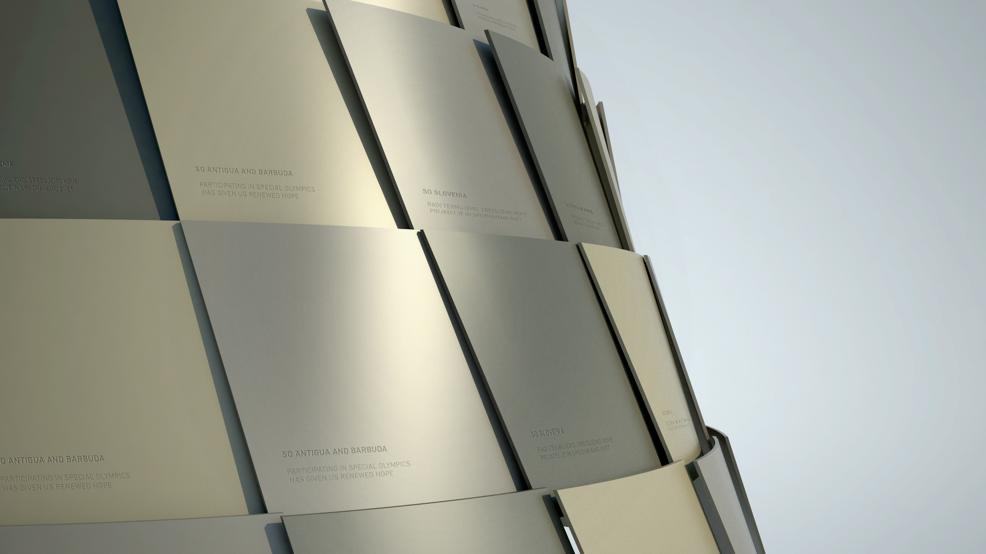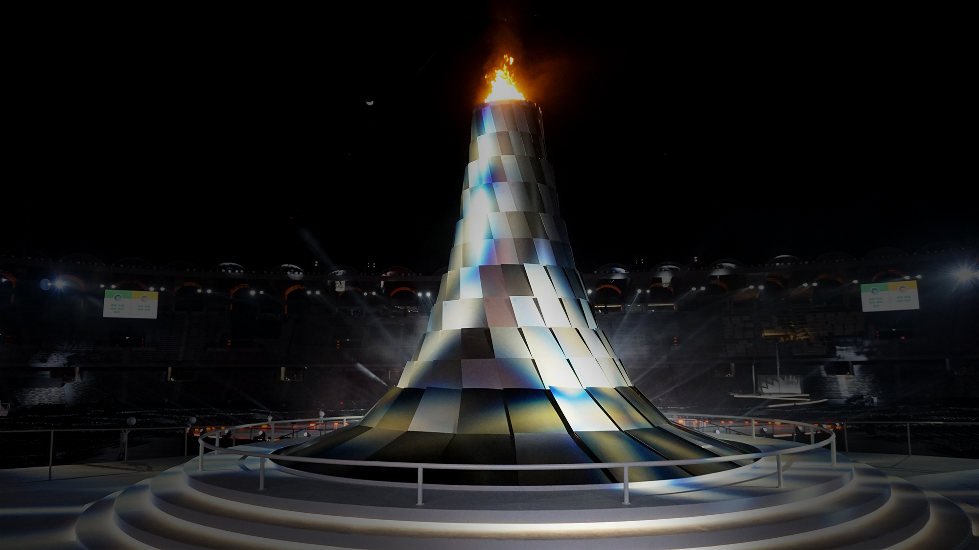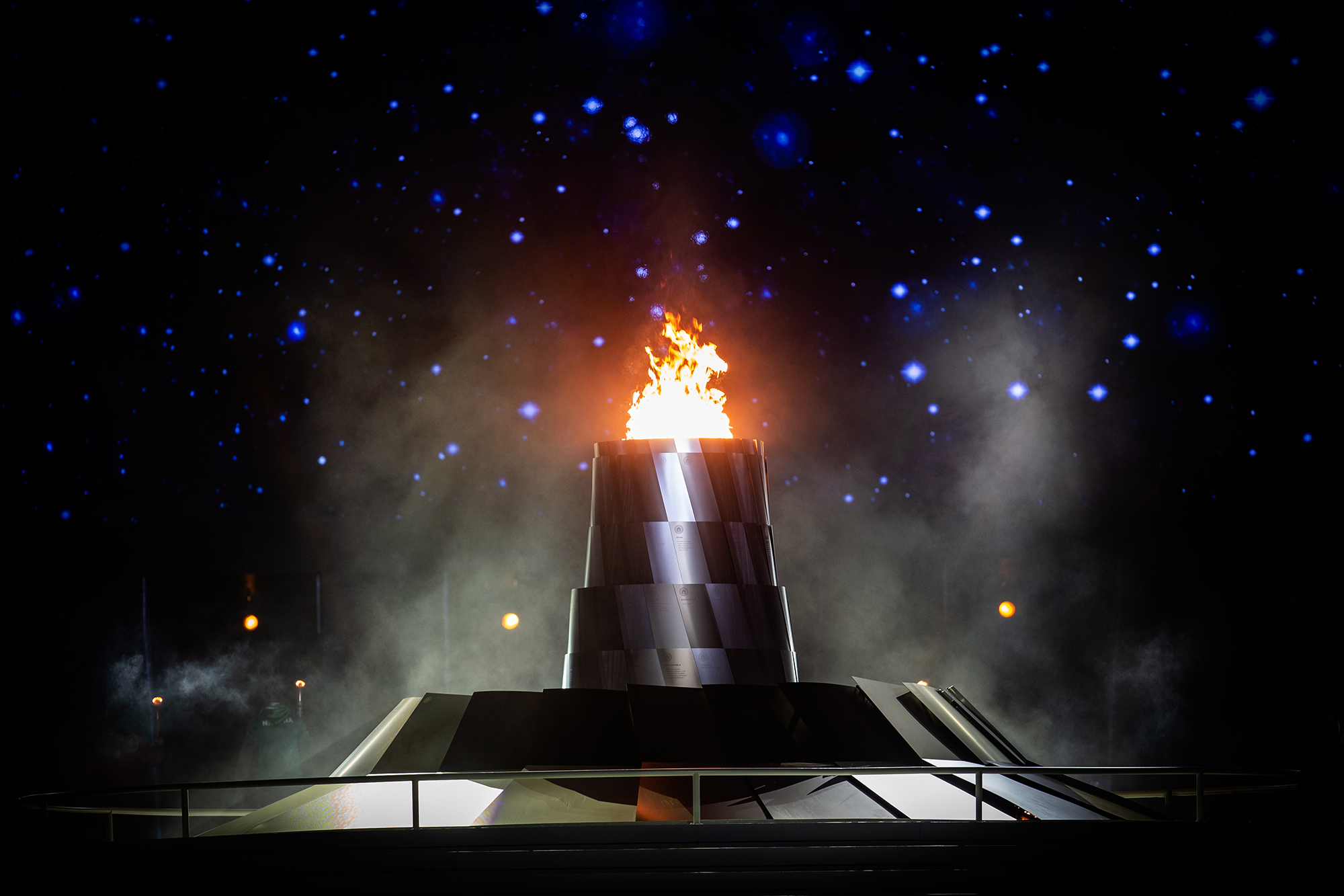 We designed a fully automated, retractable, cauldron made from 190 separate panels engraved with messages of support from each participating nation. As the structure rose out of the stage set, the panels combined through a Khoos pattern of seven concentric rings to form the cauldron.
